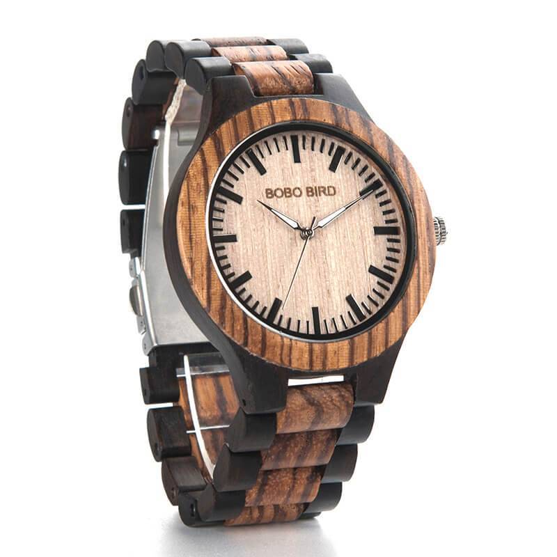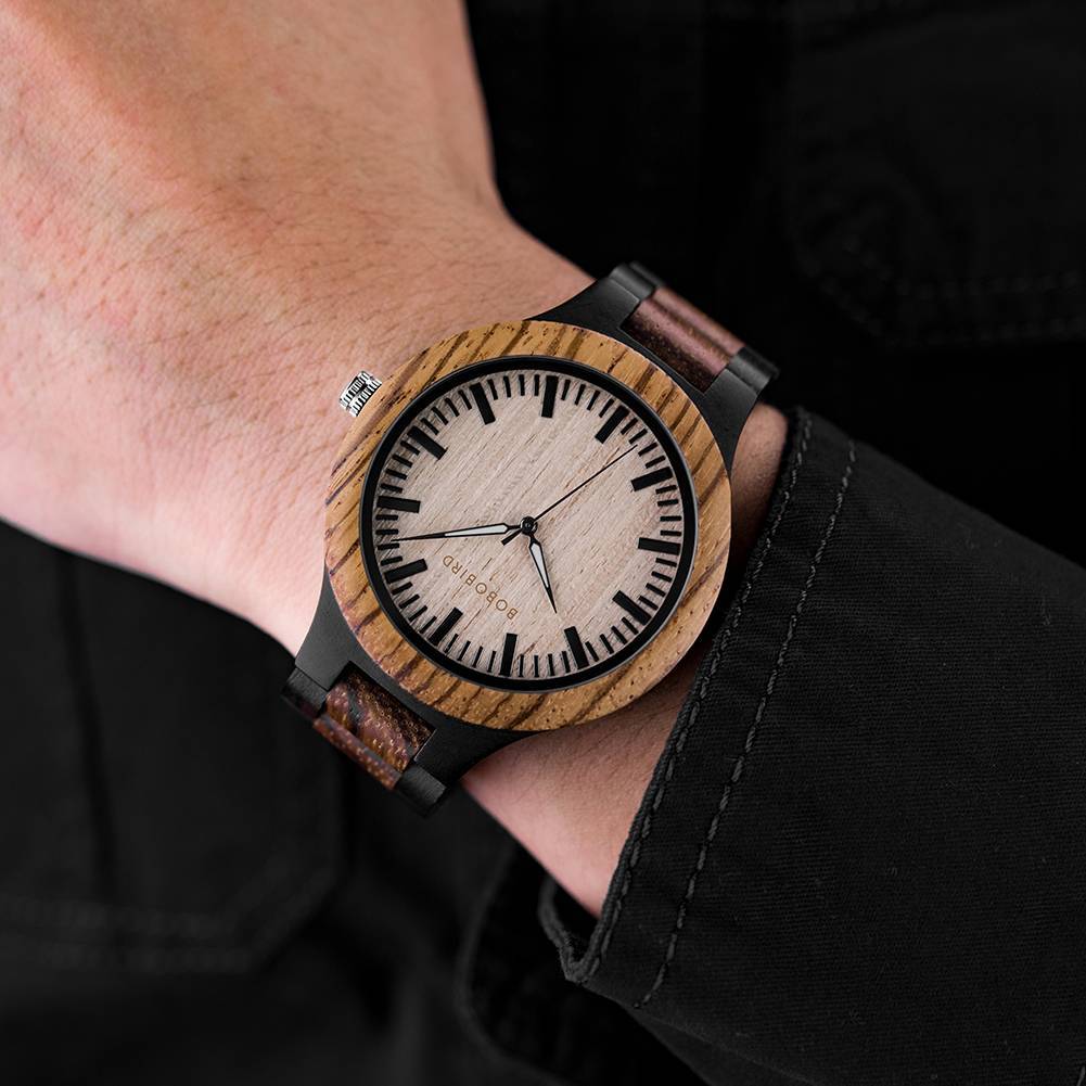 Lesena ura iz ebenovine in zebra lesa zagotavlja udobje nošenja in prepriča še tako zahtevne. Kombinacija je opazna, nenavadna in drugačna.